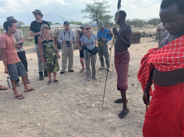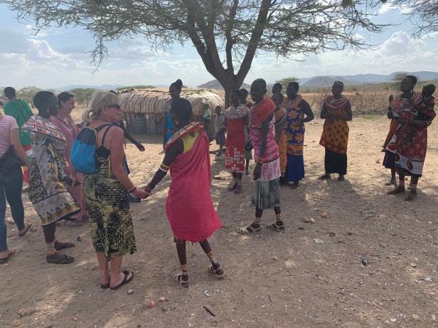 We drive several miles back in the bush to the Samburu tribal village. We are met by the villagers dressed in traditional clothing. We are given a welcome dance by the women. We are then led to where the younger children are assembled. They recite their version of the abc songs, and show that they can count all done in English!